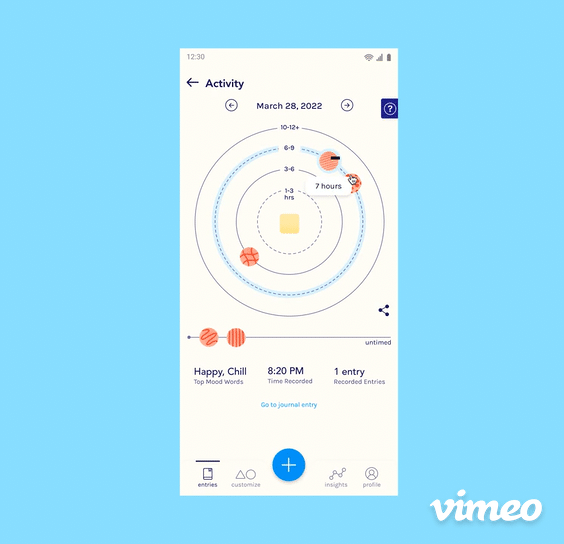 Journaling is an intimate process used for mindfulness, self-awareness, and daily tracking in mental and physical health. While there is a variety of methods for journaling, this project explores text-based stream of consciousness journaling using guided prompts translated into a digital tracking experience. The goal of a stream of consciousness journal is to help the author develop conclusions about themselves through the process of freewriting–allowing any thought or feeling to be jotted down without judgement. Because of its freeflowing nature, going back to review journal entries may not be as valuable compared to when it is being written. Reinterpreting this written data through a customized data visualization mobile application experience utilizing text analysis and AI recognition software may help young adults (such as college students) find meaningful connections between overlooked topics that were not originally found. This can be useful in finding trends and patterns over an extensive period of time, which is difficult to pinpoint when manually reviewing written entries. In recent studies, journaling for students has been useful in developing their critical thinking skills, building confidence, and improving gratitude. This project strives to encourage young adults to become more in tune with themselves through the habit of journaling for self-care and relaxation from their busy lives.
